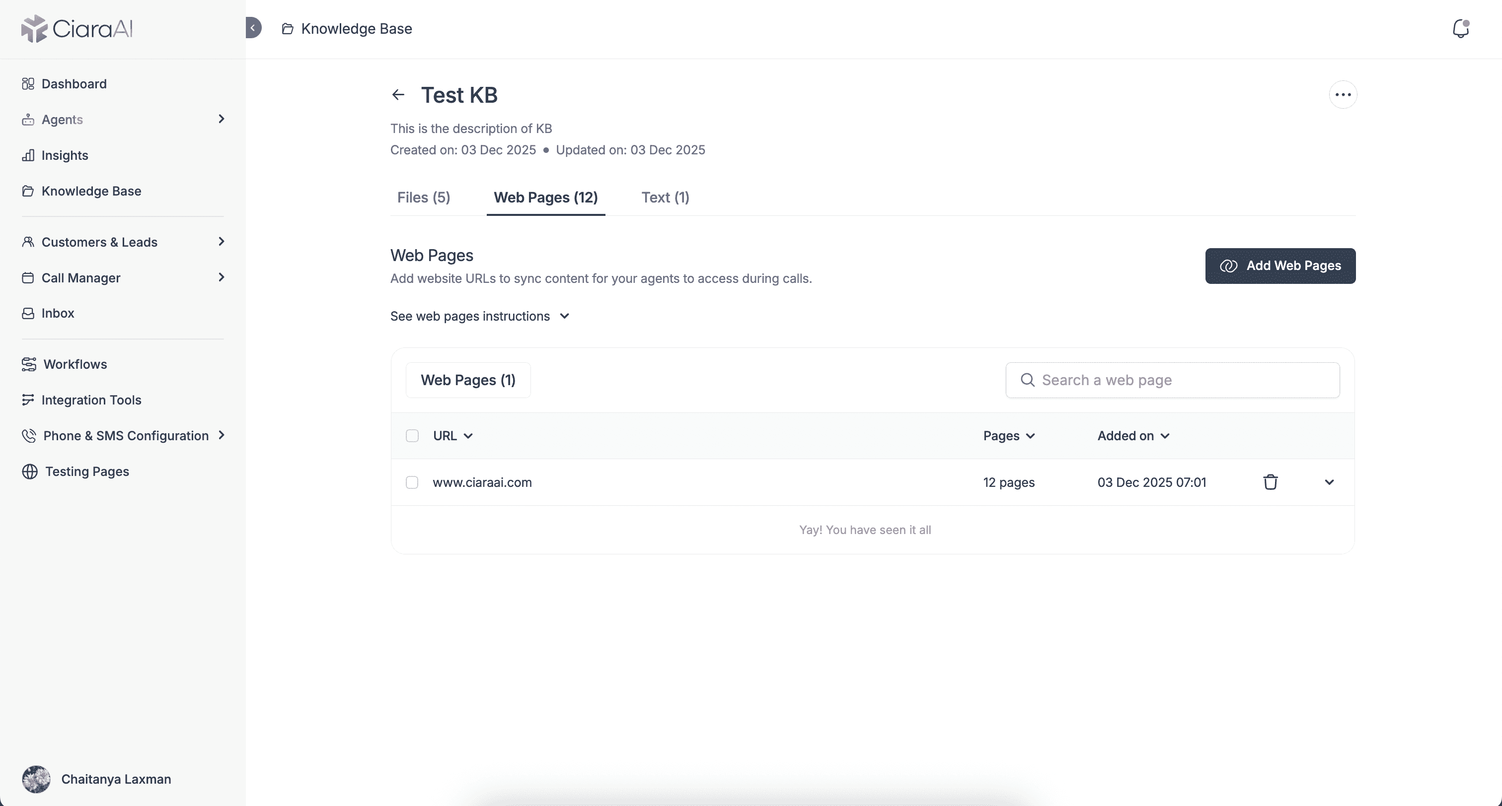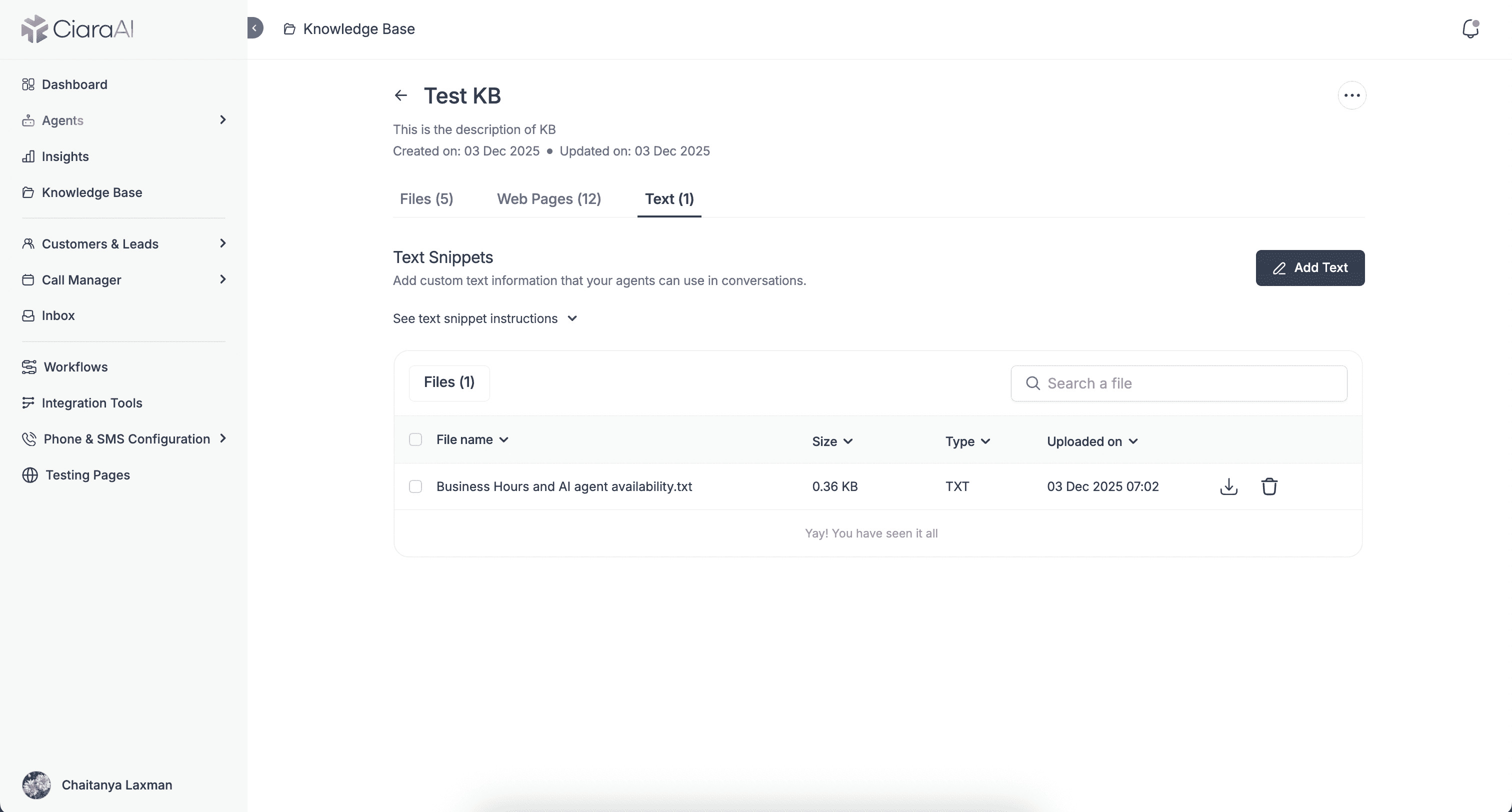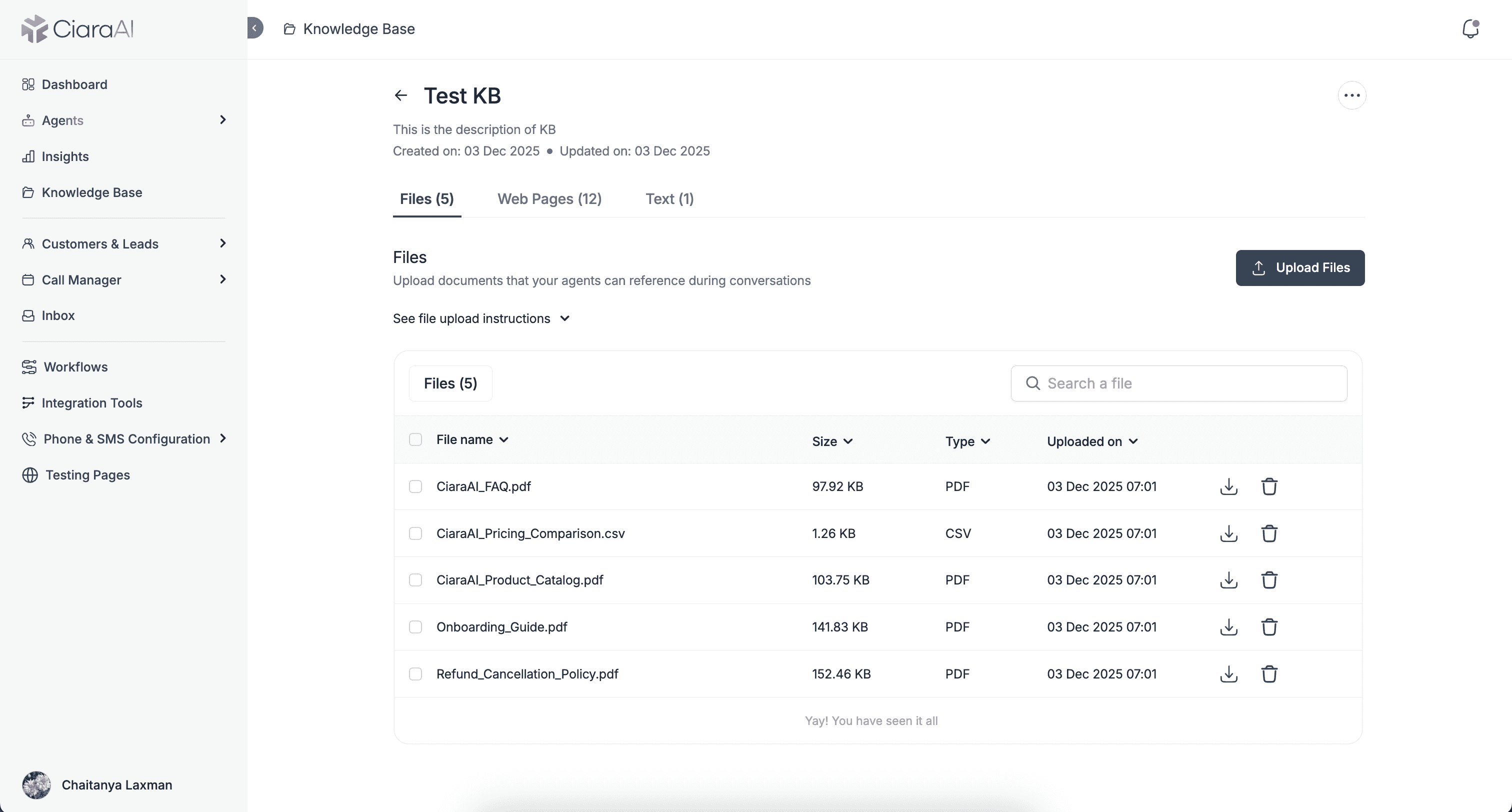 Link to your agents — Connect the KB to one or more AI agents. They'll automatically reference this knowledge during conversations.